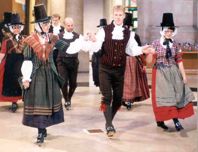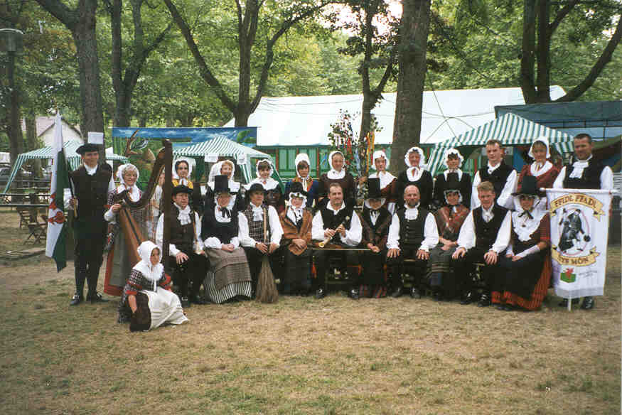 Huw a Bethan Roberts - Arweinyddion Ffidl Ffadl. Mae Huw yn gwisgo atgynhyrchiad o wisg telynor teulu Plas Llanofer (gellir gweld y wisg wreiddiol yn Amgueddfa Werin Cymru yn Sain Ffagan, Caerdydd). Daw wisg Bethan o Orllewin Cymru ac mae'n dyddio o tua 1840. The photograph is of Huw and Bethan Roberts, leaders of Ffidl Ffadl. Huw is wearing a replica of the harper's costume as worn in Plas Llanofer (the original can be seen at the Museum of Welsh Life at St Fagans, Cardiff). Bethan is wearing an authentic West Wales version of the traditional Welsh costume circa 1840